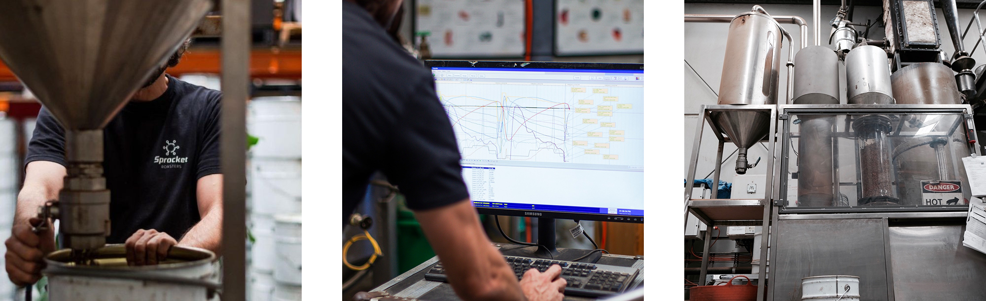 Whereas conventional commercial roasters use afterburners to dispose of the chaff into the atmosphere, Sprocket’s coffee roaster captures this chaff instead and recycles it as fuel, resulting in near-zero emissions. The process is controlled by a programmable logic controller (PLC), an industrial computer. This means that we have roast profiles that go back years as an added measure of profile roasting to ensure consistency.